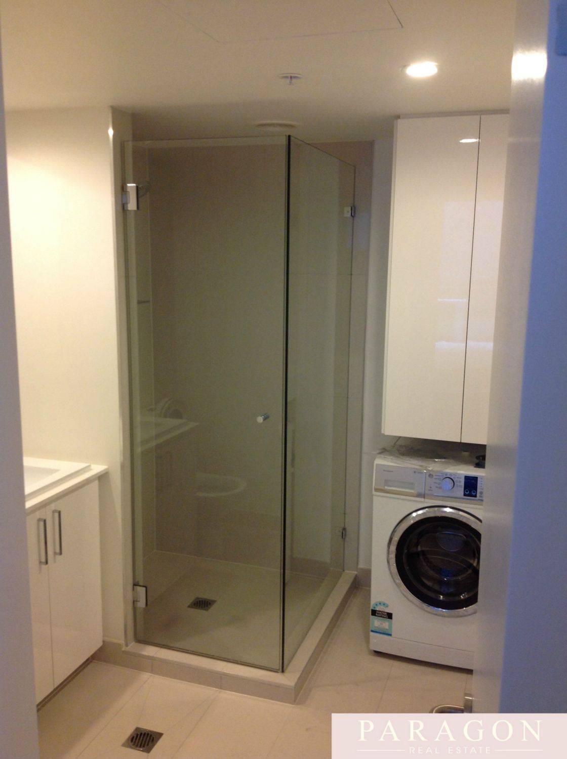 - Contemporary bathroom with vanity unit and private laundry