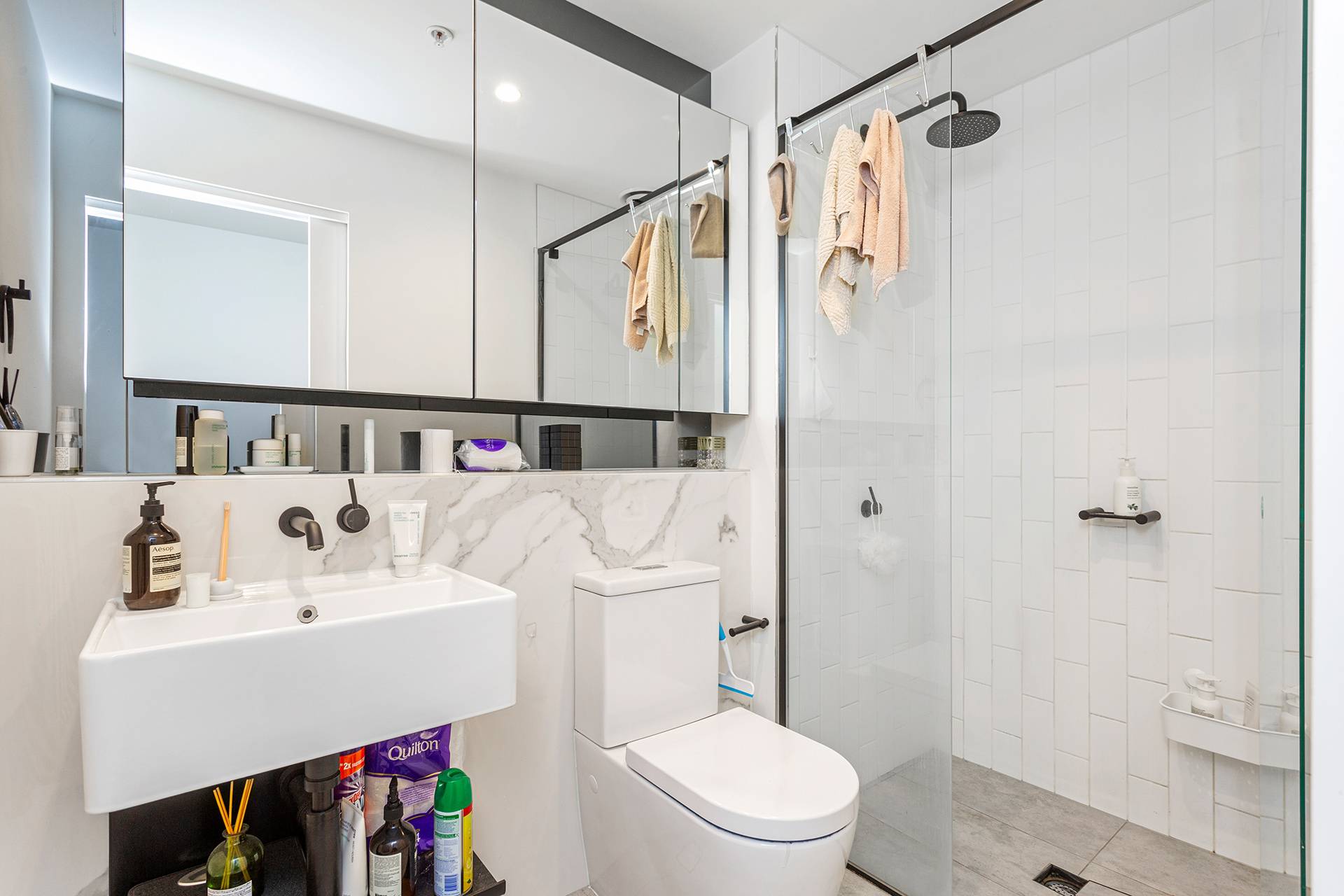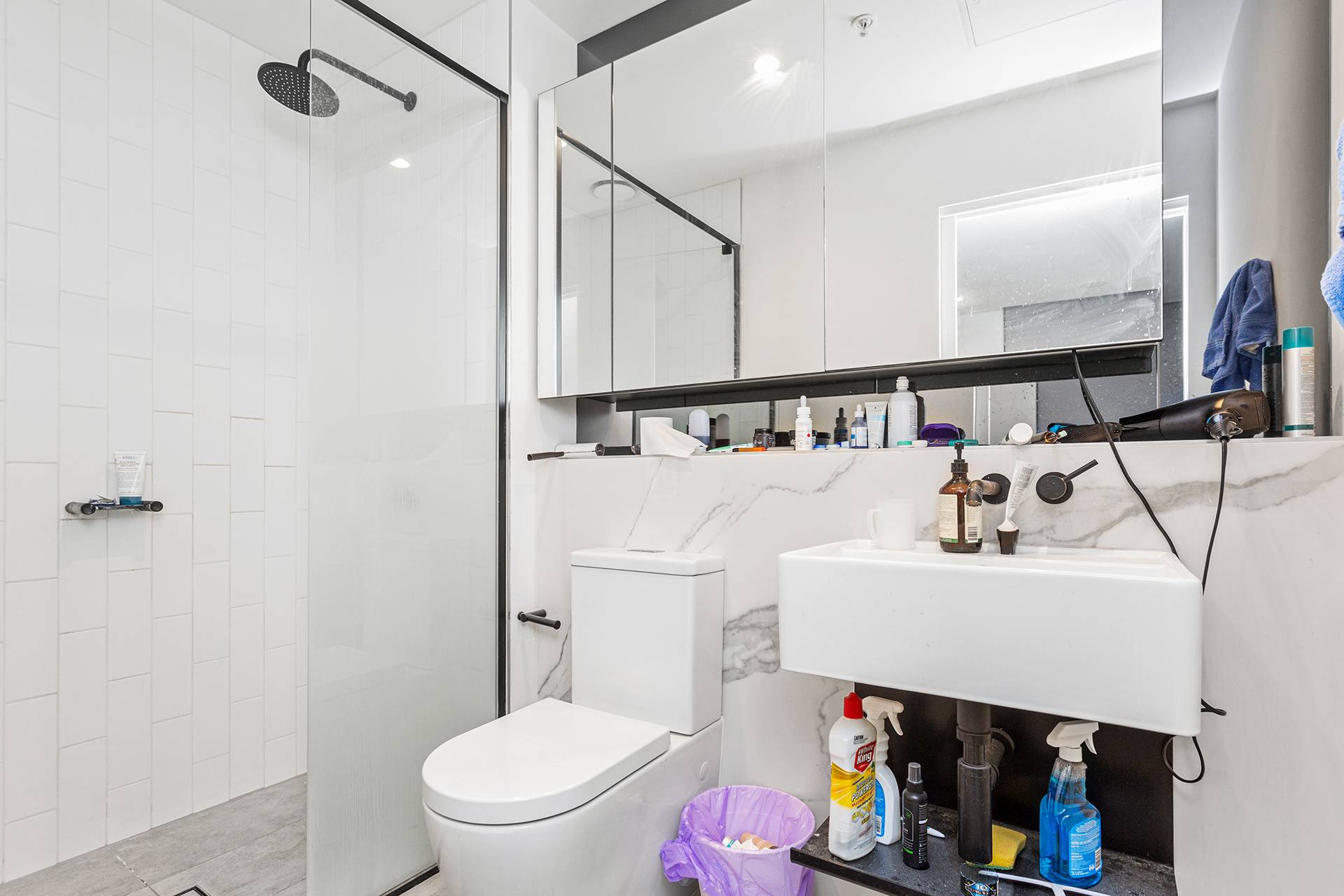 - Two contemporary bathrooms with rainfall showers