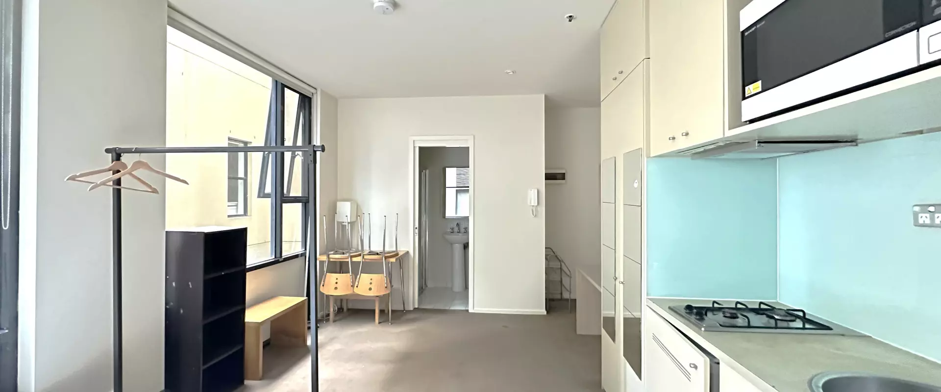 Fully Furnished studio apartment features; security entrance, open plan kitchenette,