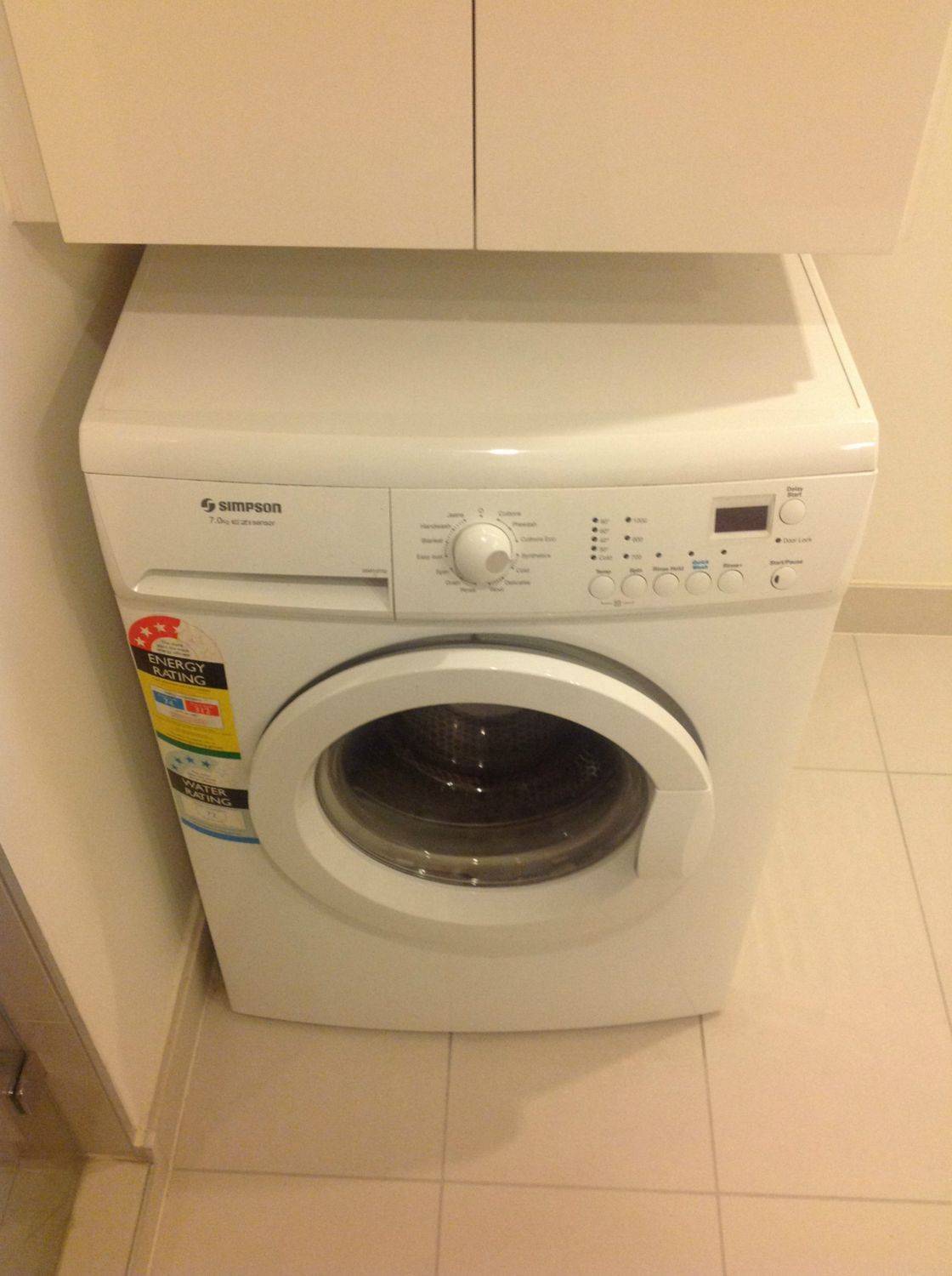 - Contemporary bathroom with vanity unit and private laundry with washing machine