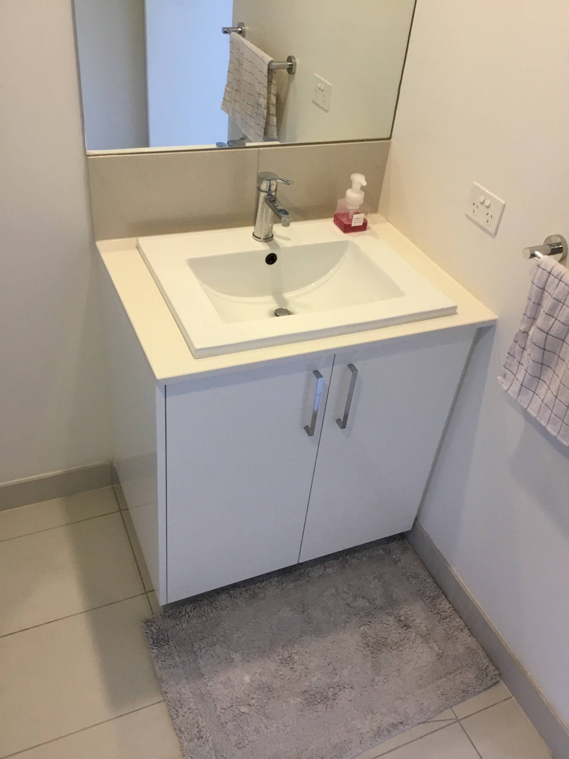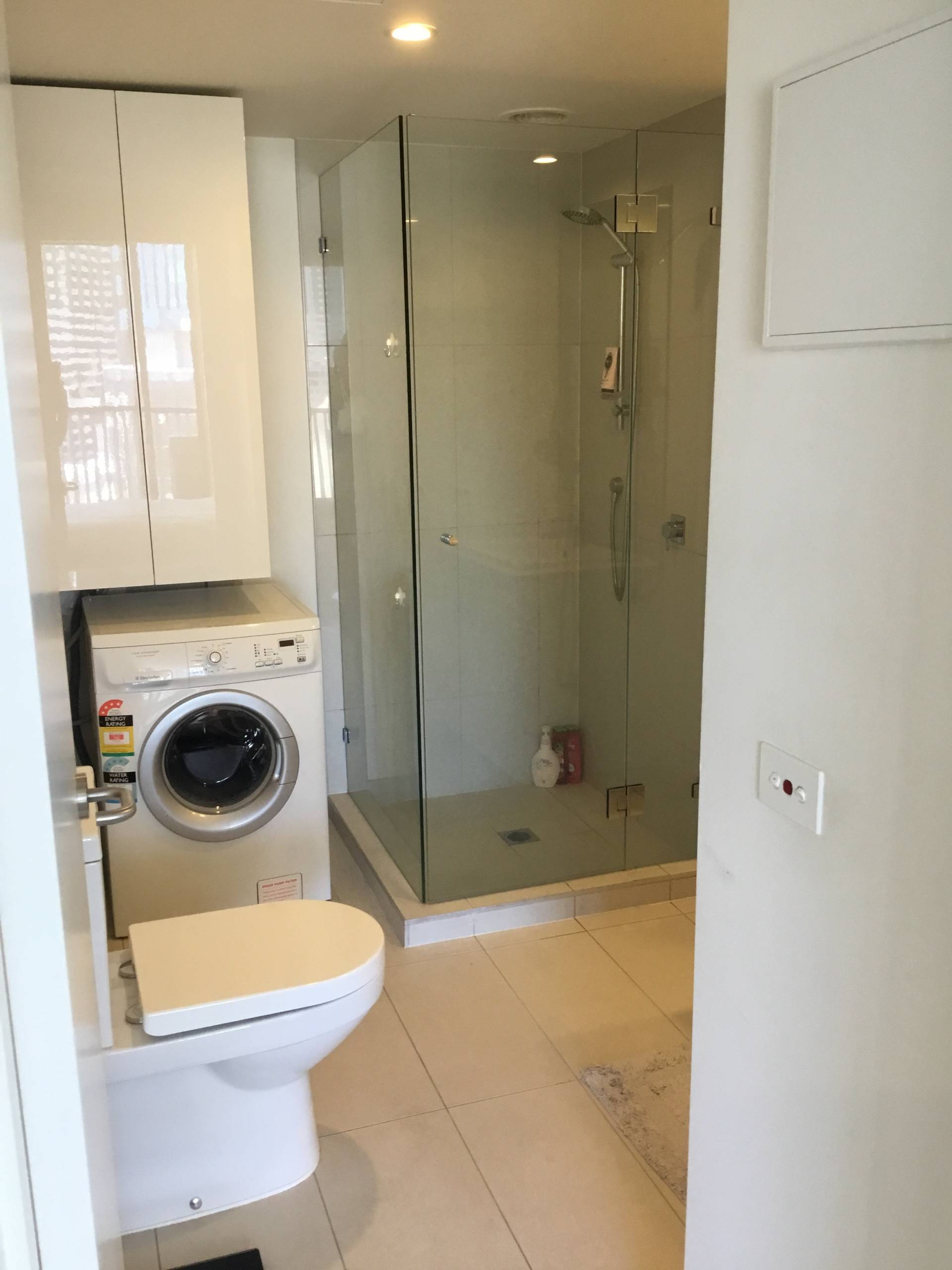 - Contemporary bathroom with vanity unit and private laundry