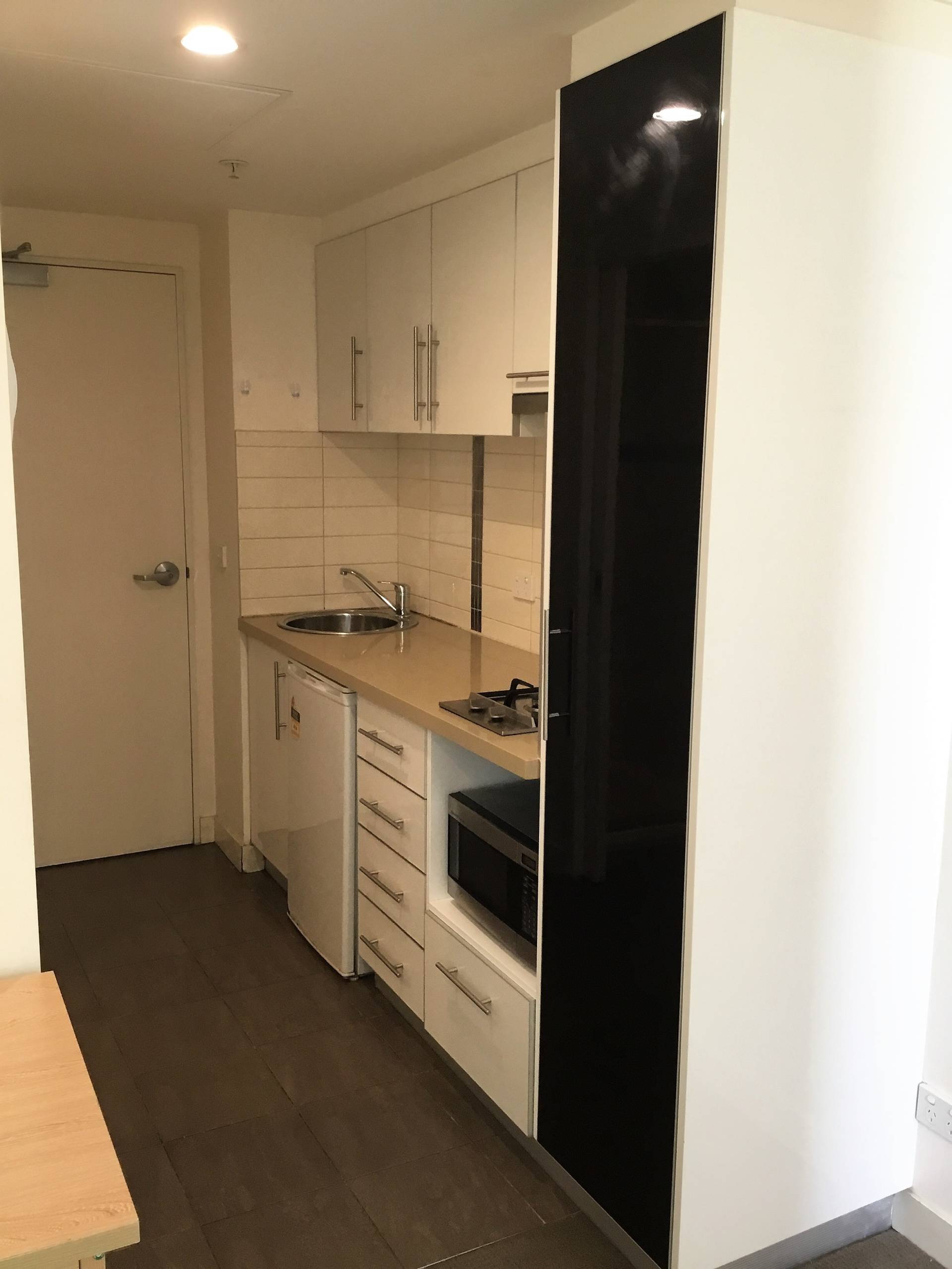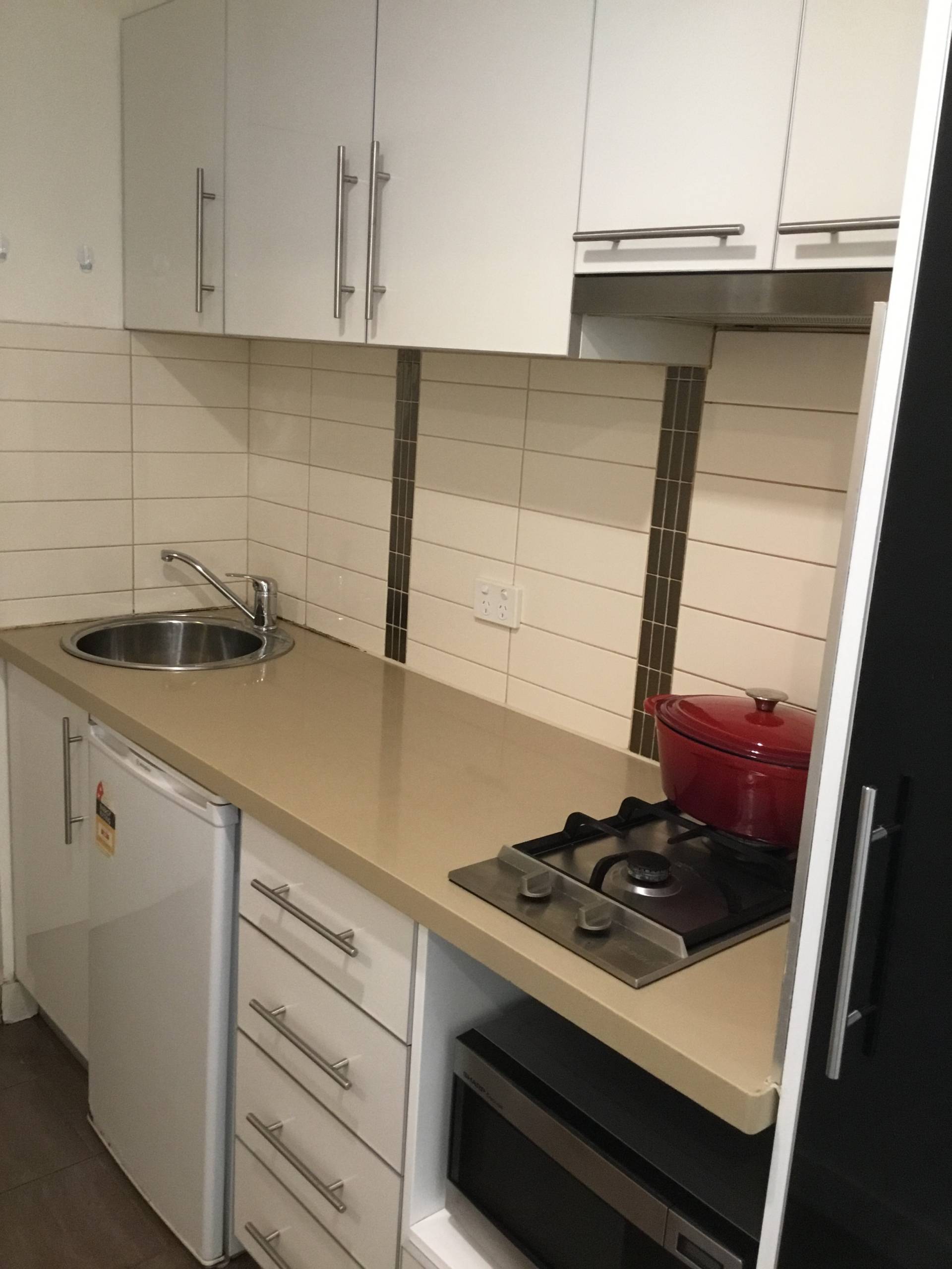 This modern apartment with bed, study desk, modern bathroom, kitchen with stainless steel gas cooking and good storage.